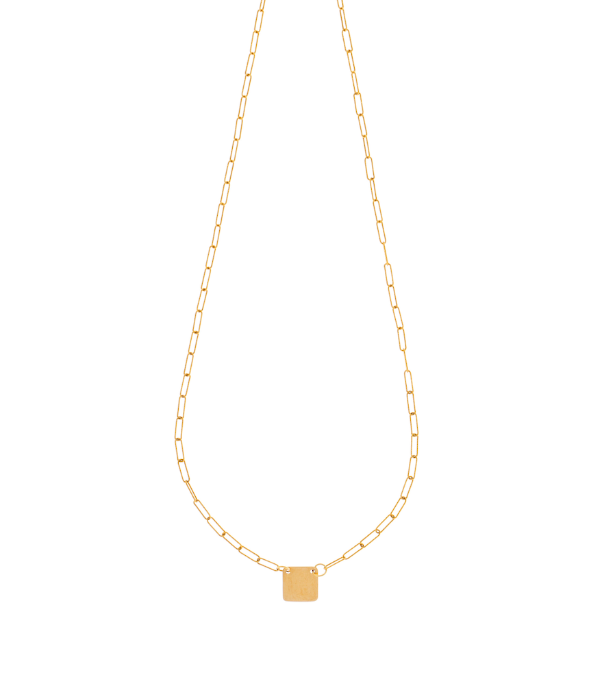 Collana con medaglietta rettangolare e catena geometrica in argento placcato oro 18 kt. Lunghezza 64 centimetri.
