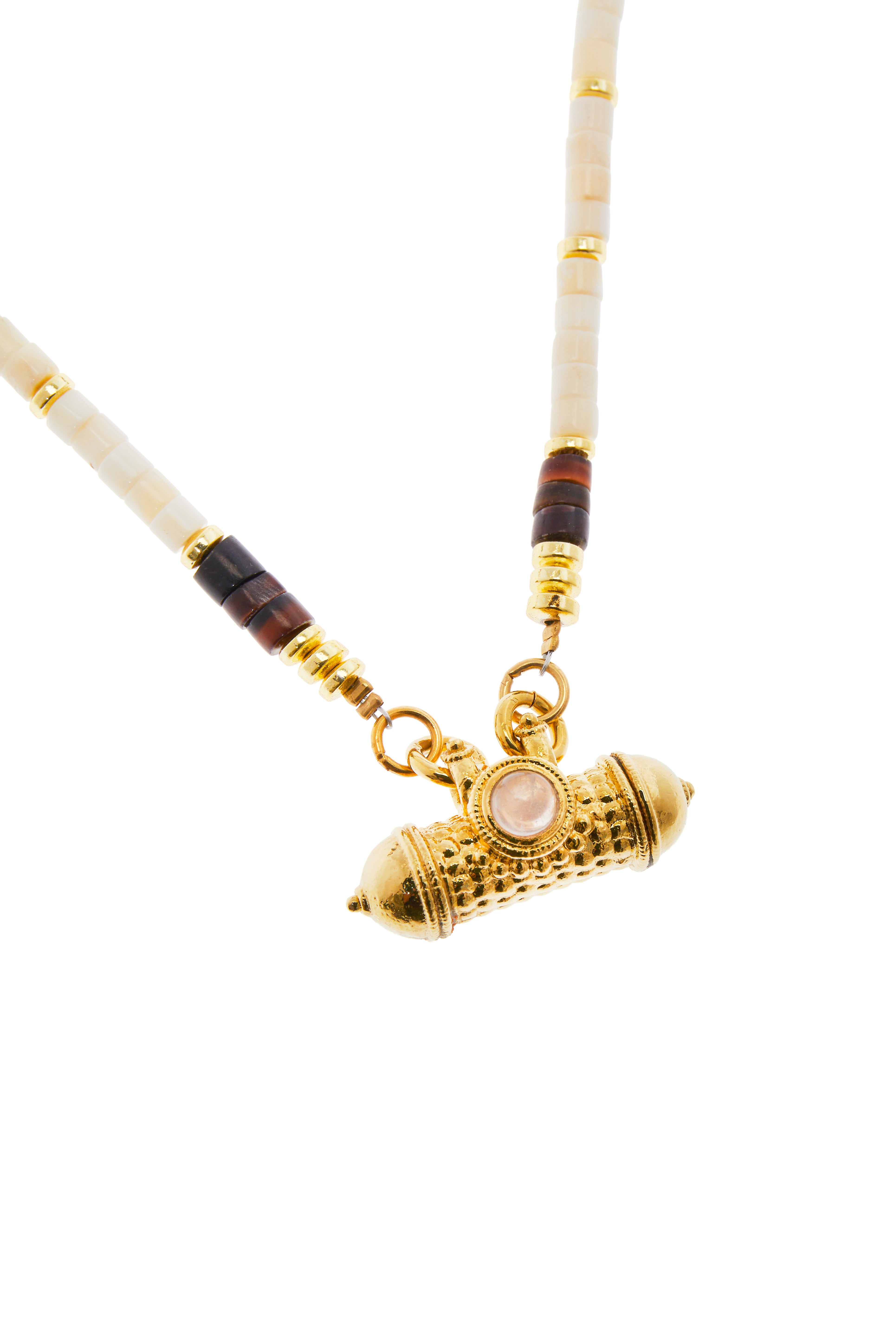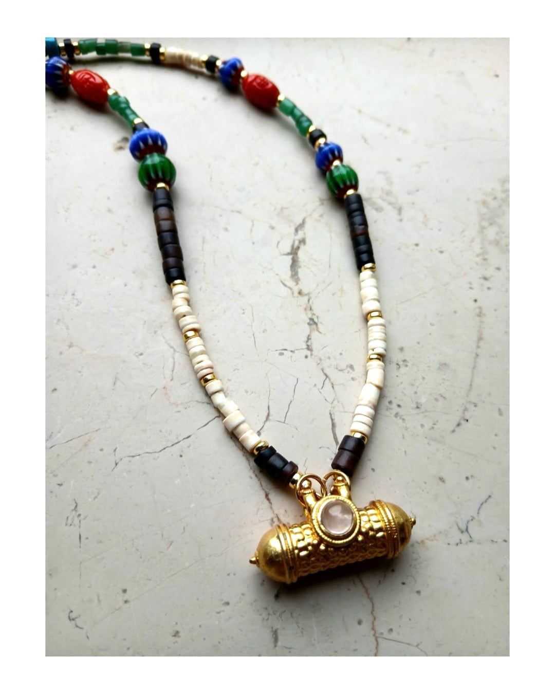 Collana realizzata a mano con pietre diverse, tra cui: ruote di madreperla, onice nero, turchese, corallo bamboo e giada verde. Al centro ciondolo indiano placcato oro 18 kt.