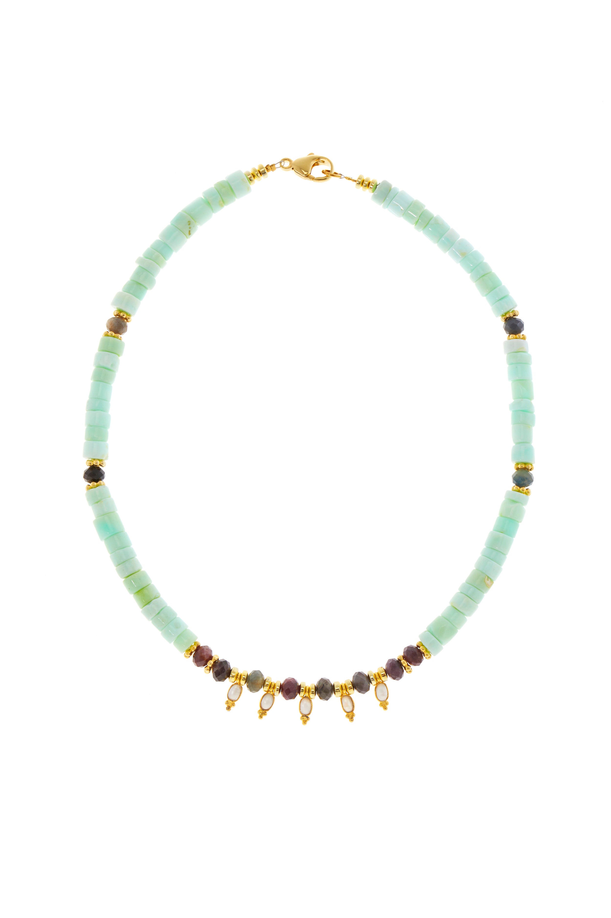 Collana realizzata a mano, con ruote di opale azzurro intervallate da tormaline multicolor e dischi di ematite placcati oro 18kt. Lunghezza 40,5 cm.