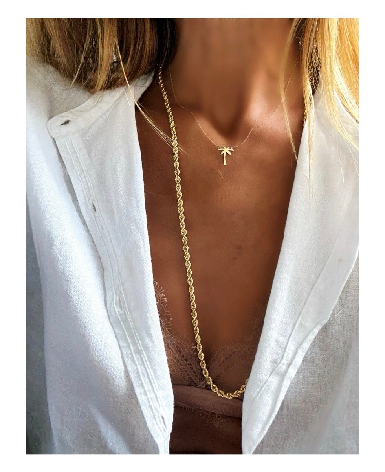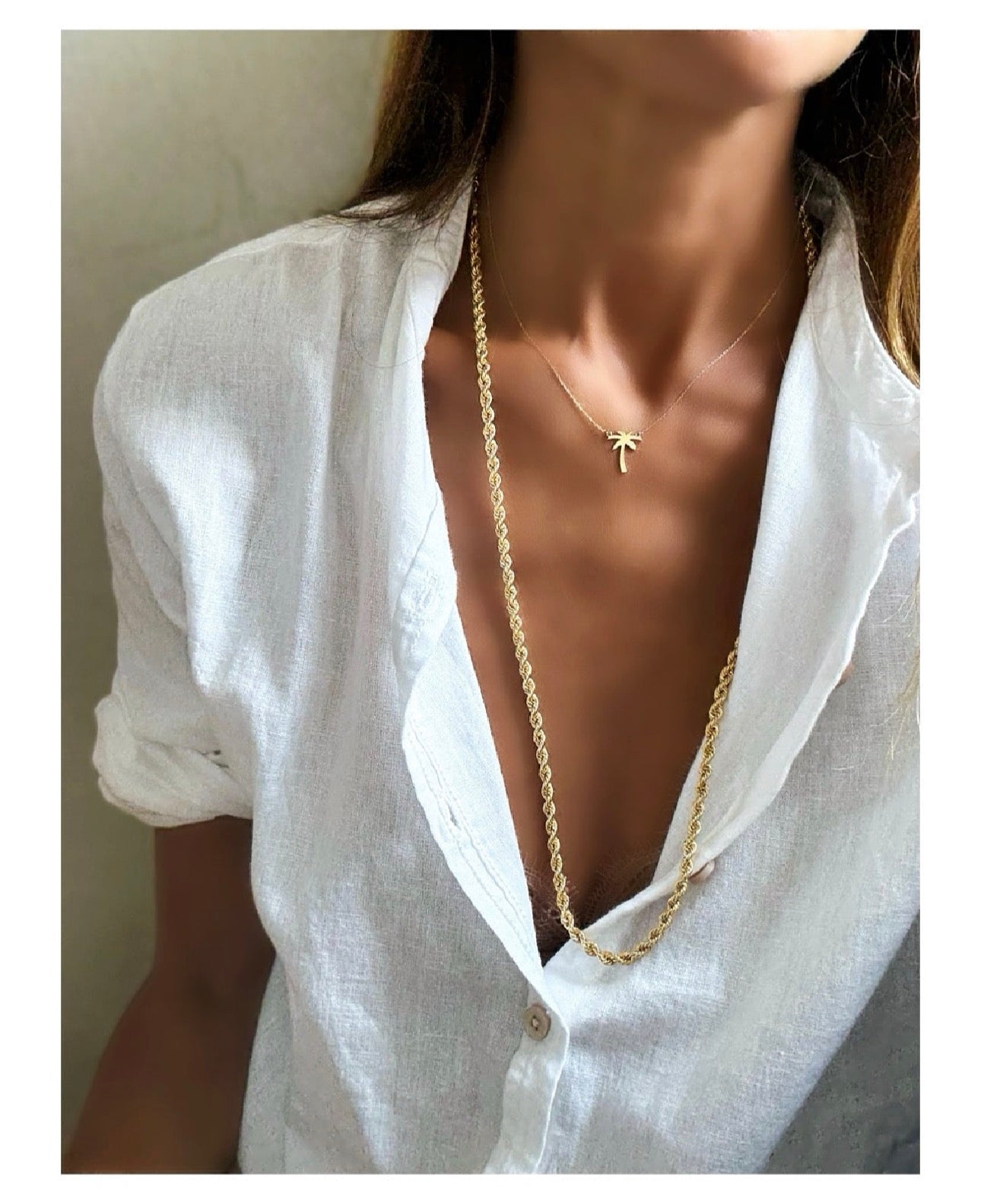 Collana in oro 18 kt con al centro una palma in oro 18 kt, altezza 1,5 cm. Lunghezza 41 cm.