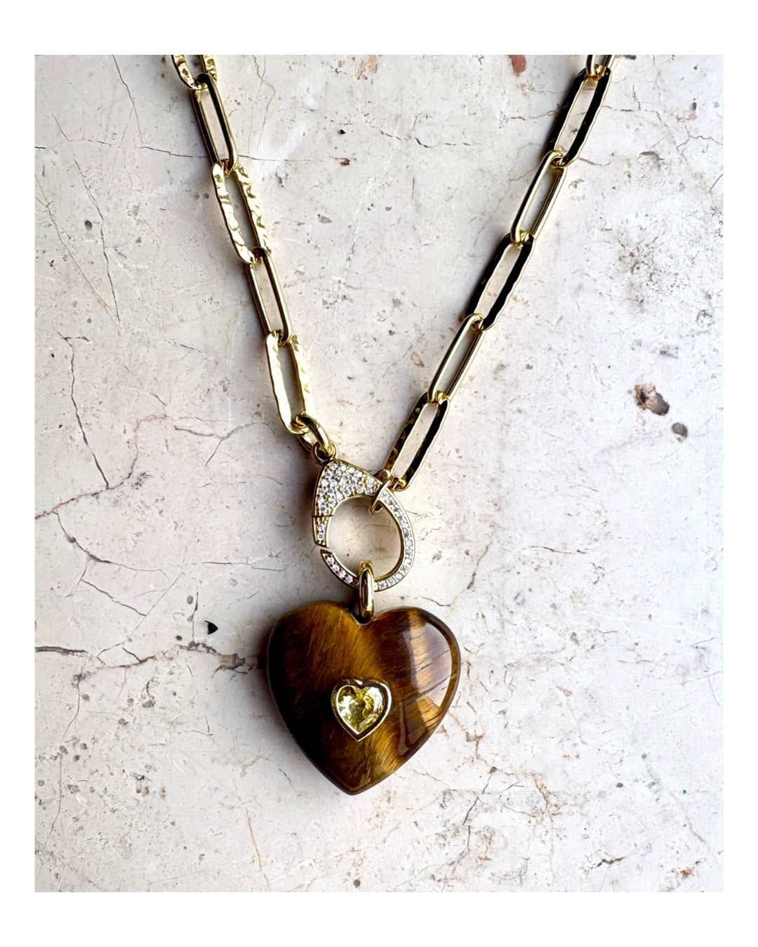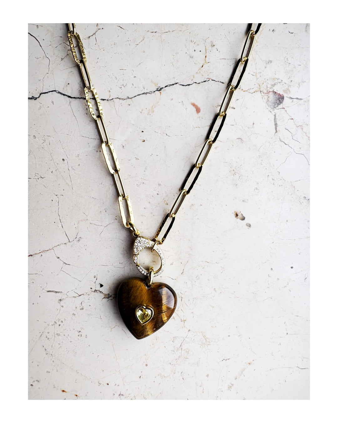 Collana in maglia geometrica in argento placcato oro con chiusura a moschettone, impreziosito da piccoli brillantini. Ciondolo in occhio di tigre con cuore centrale in quarzo citrino. Lunghezza 46,5 cm.