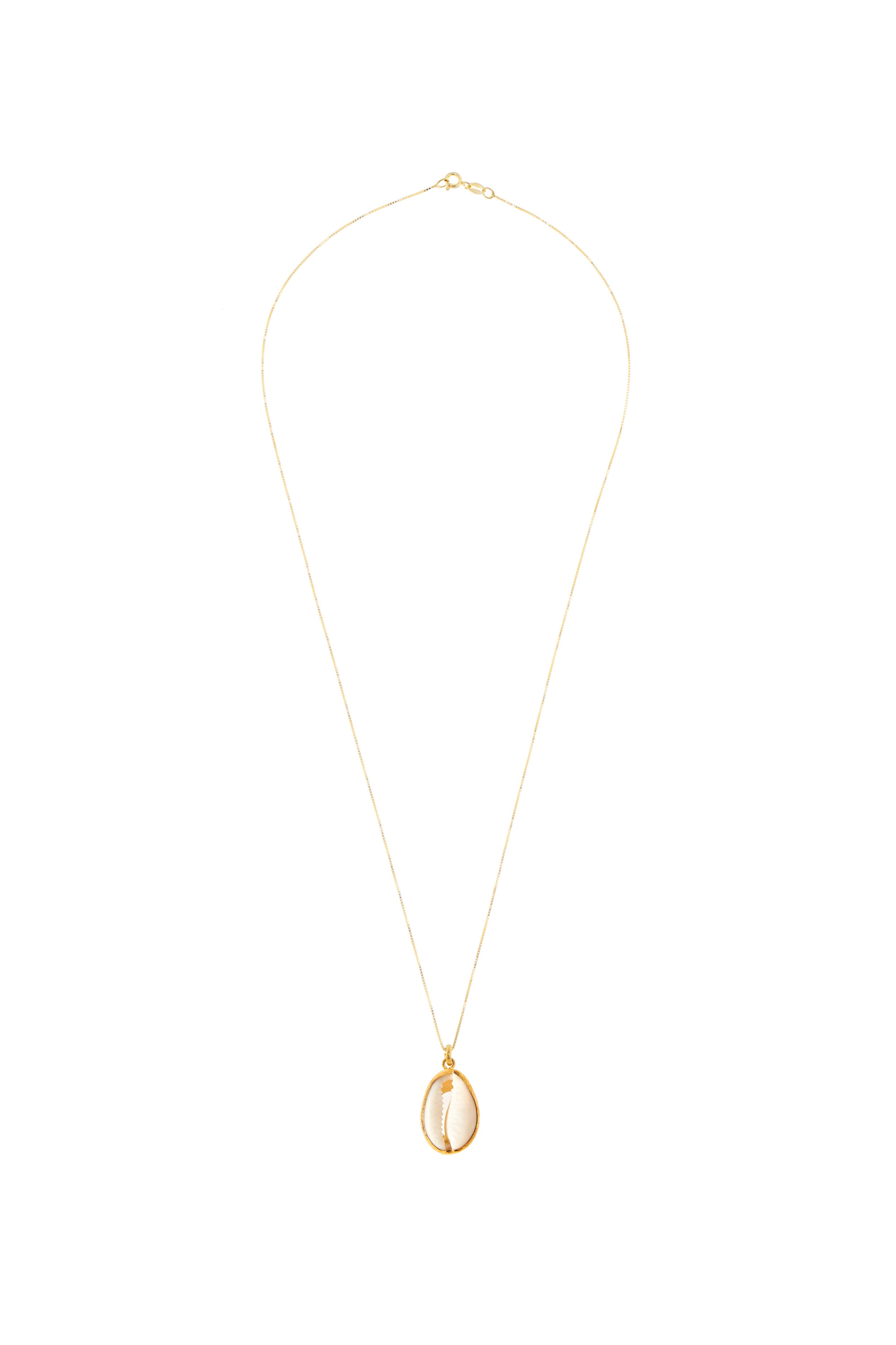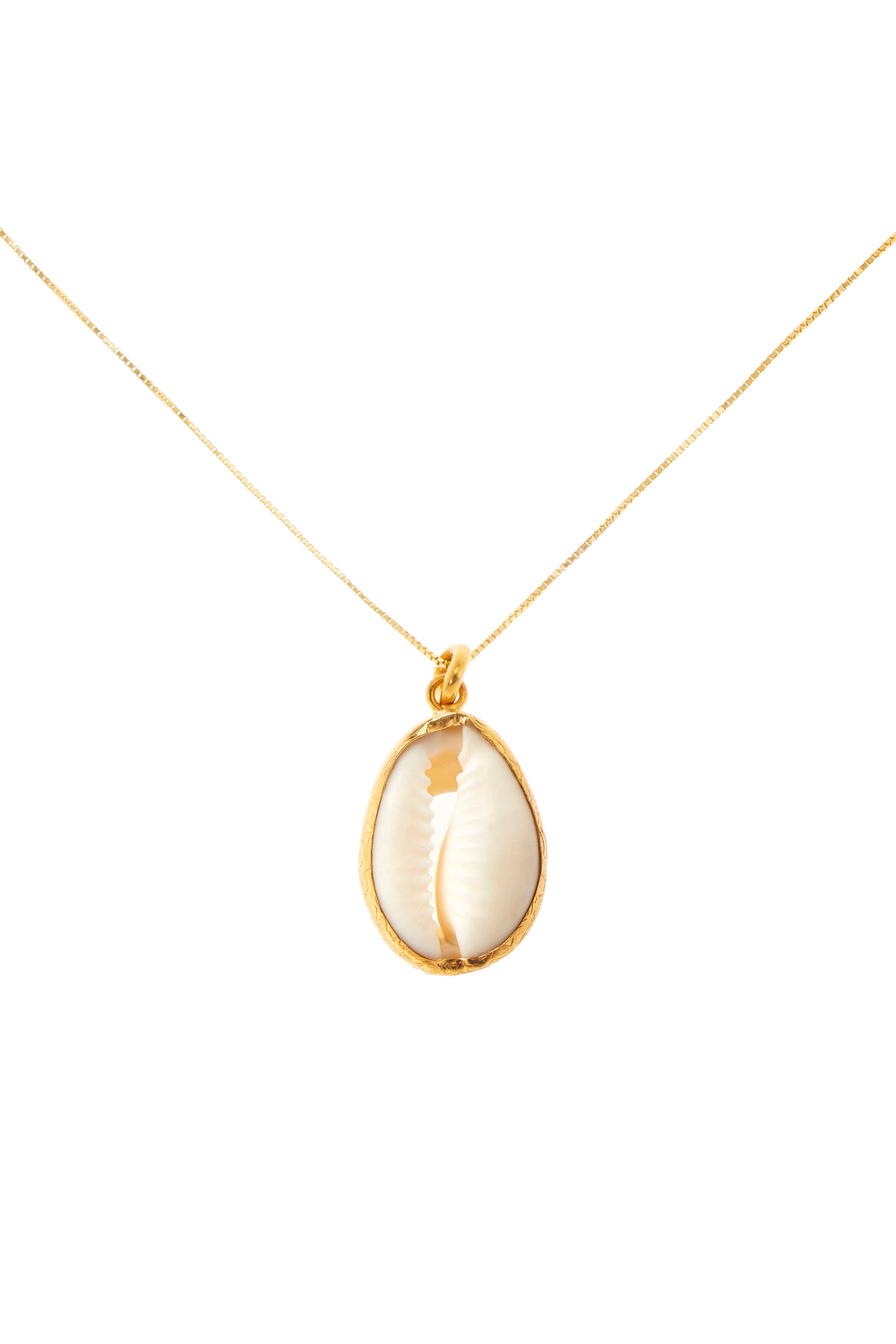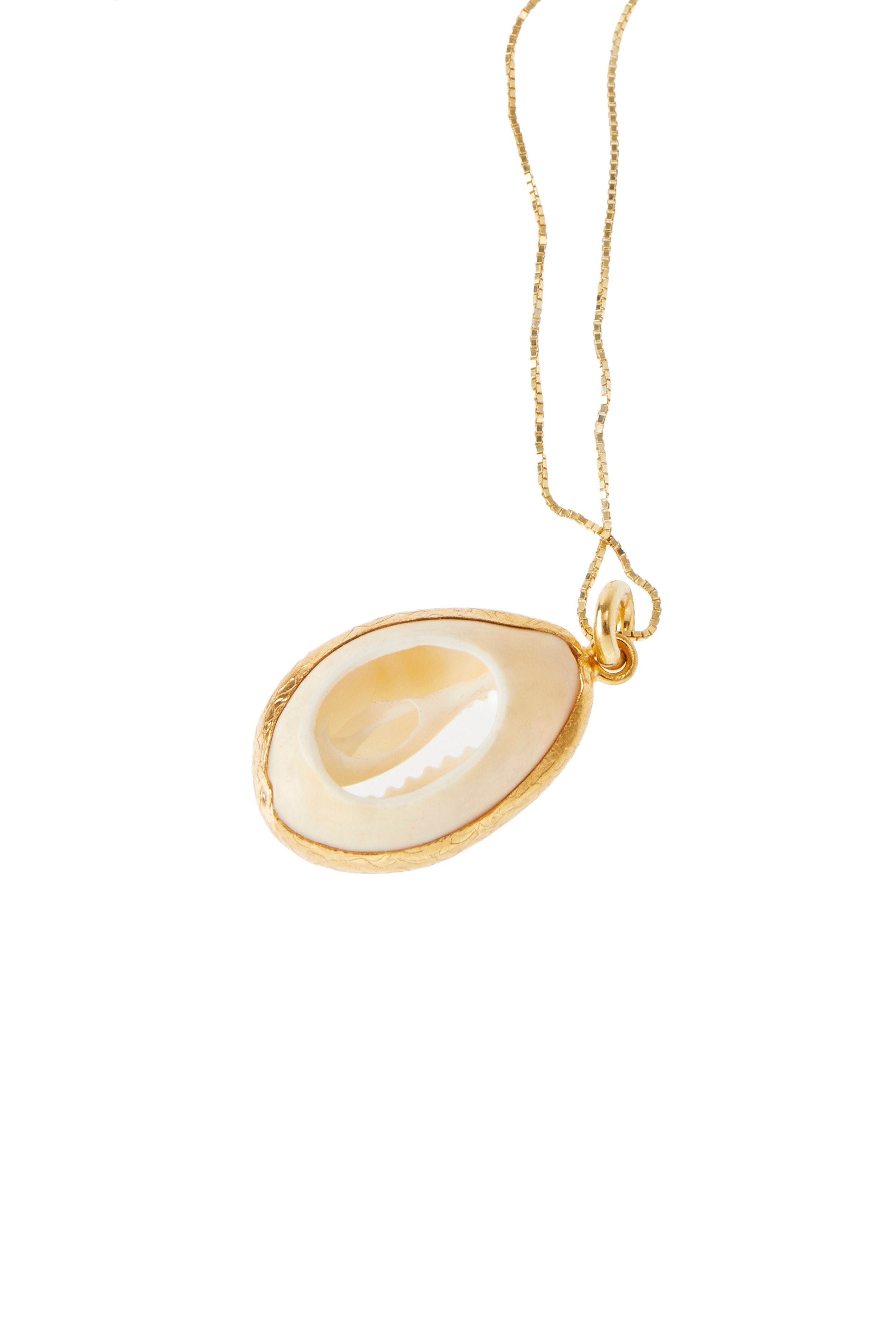 Collana in argento placcato oro avente come ciondolo una ciprea bordata in oro. Lunghezza 56 cm.