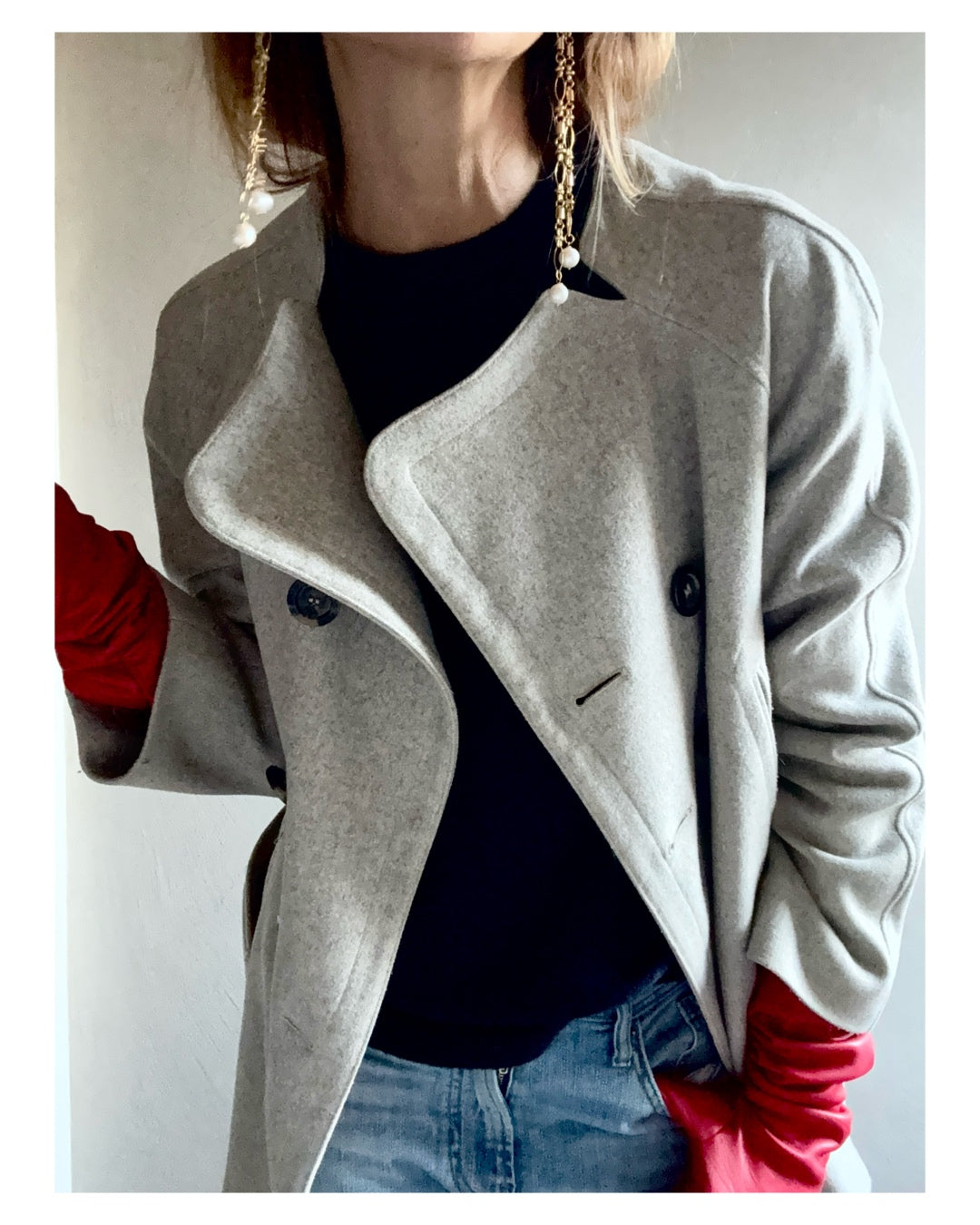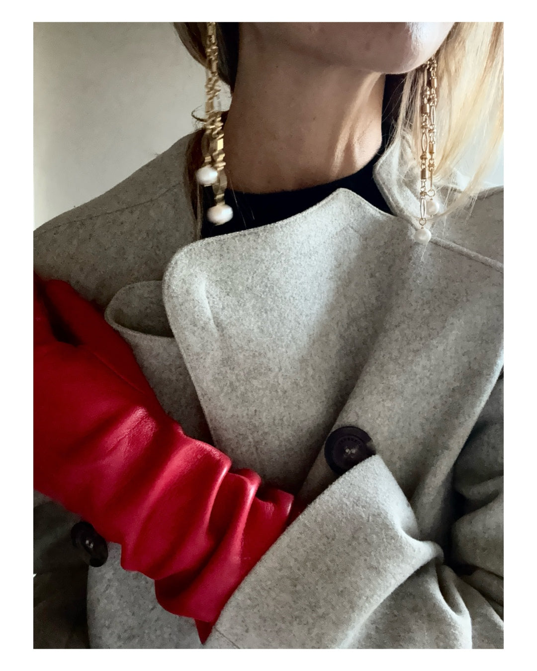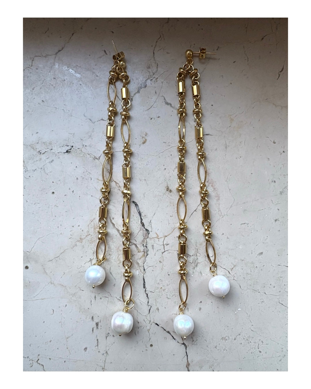 Orecchini lunghi composti da catena lavorata decó con finale di perle di lago. Lunghezza 11 cm. Placcato oro 18 kt.